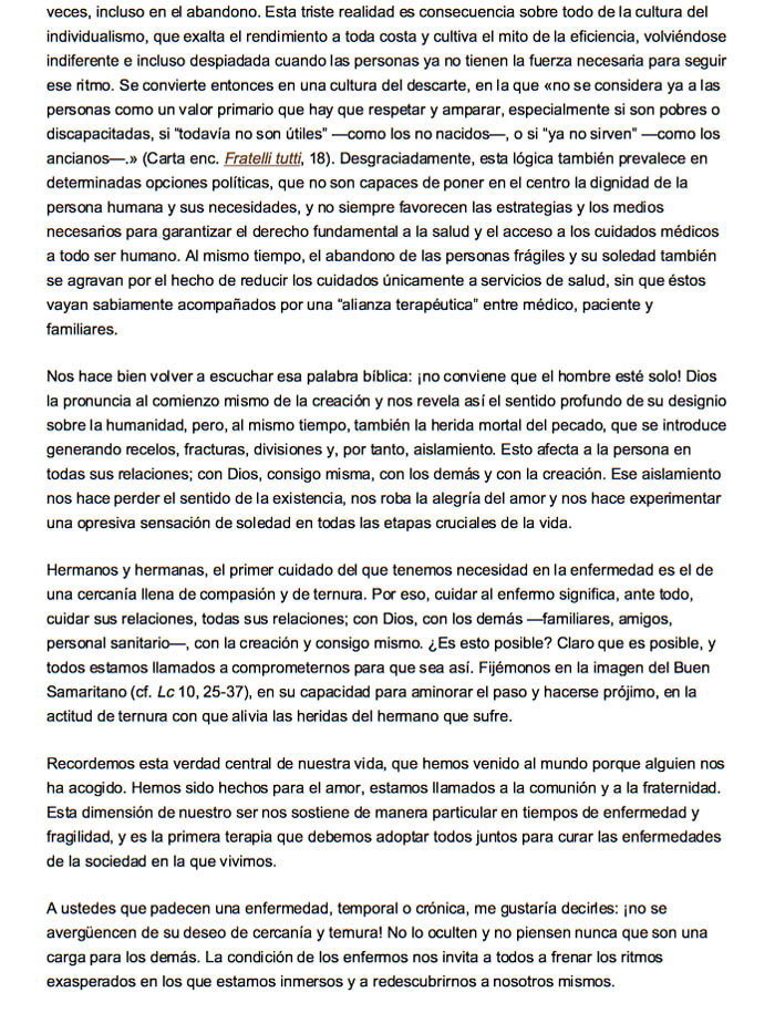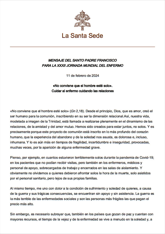 NO CONVIENE QUE EL HOMBRE ESTÉ SOLO. CUIDAR AL ENFERMO CUIDANDO LAS RELACIONES.
